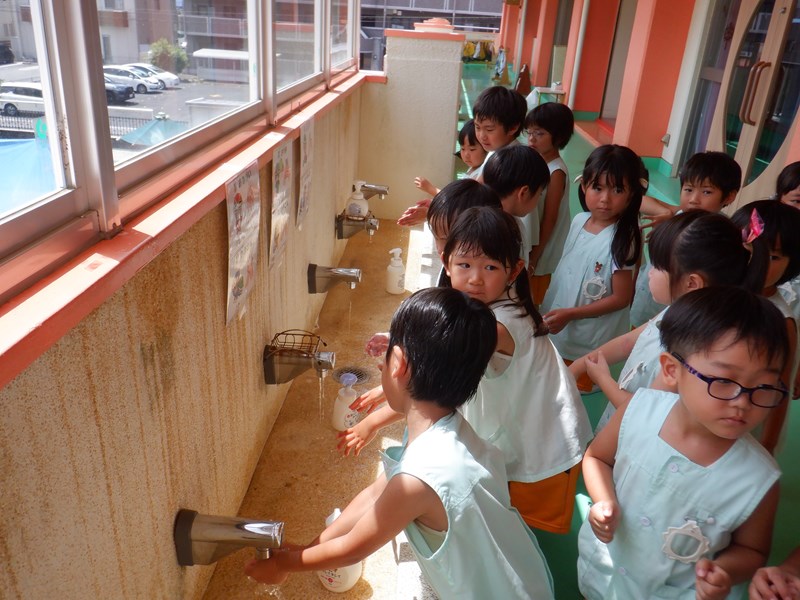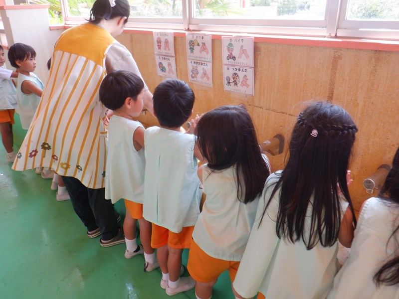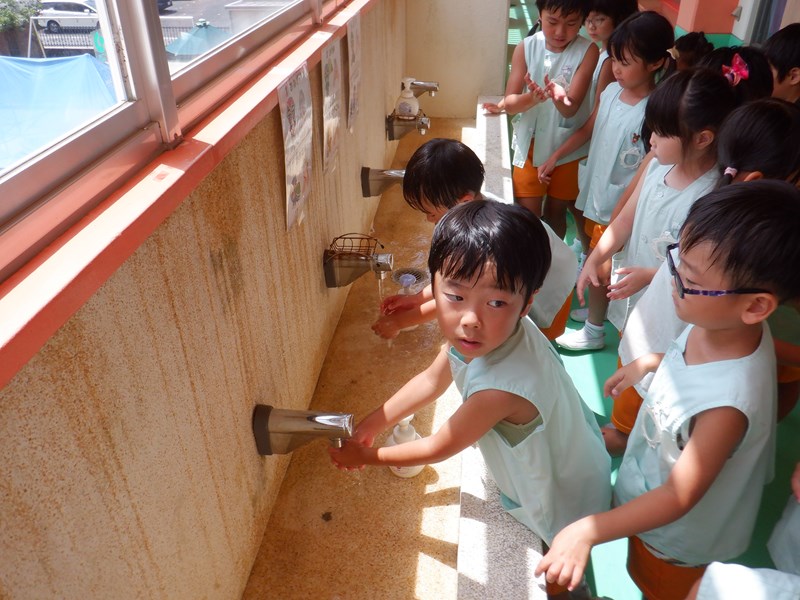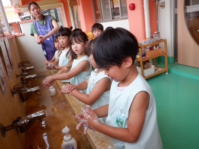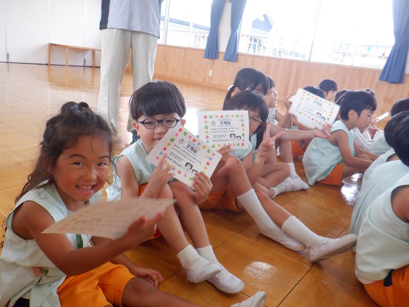 年長さんみんなが手洗いマイスターの合格証をもらいましたので、家庭でも歌を教えてもらってみてくださいね。子どもたちは手をしっかり洗えるようになりました。保健所の皆さん、ありがとうございました。