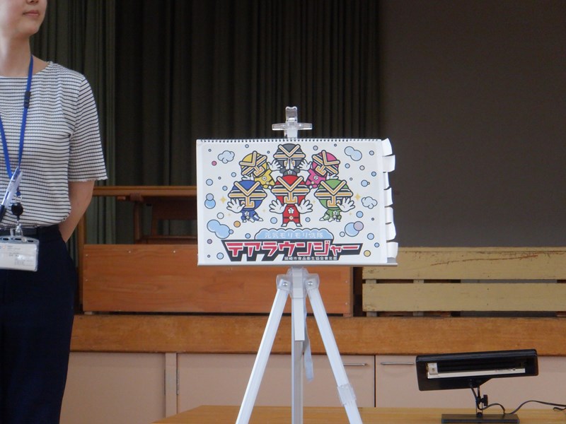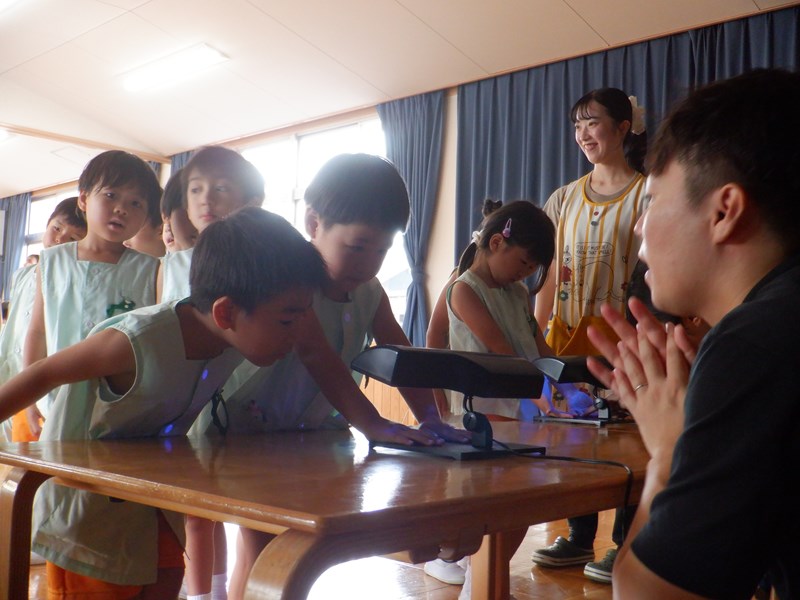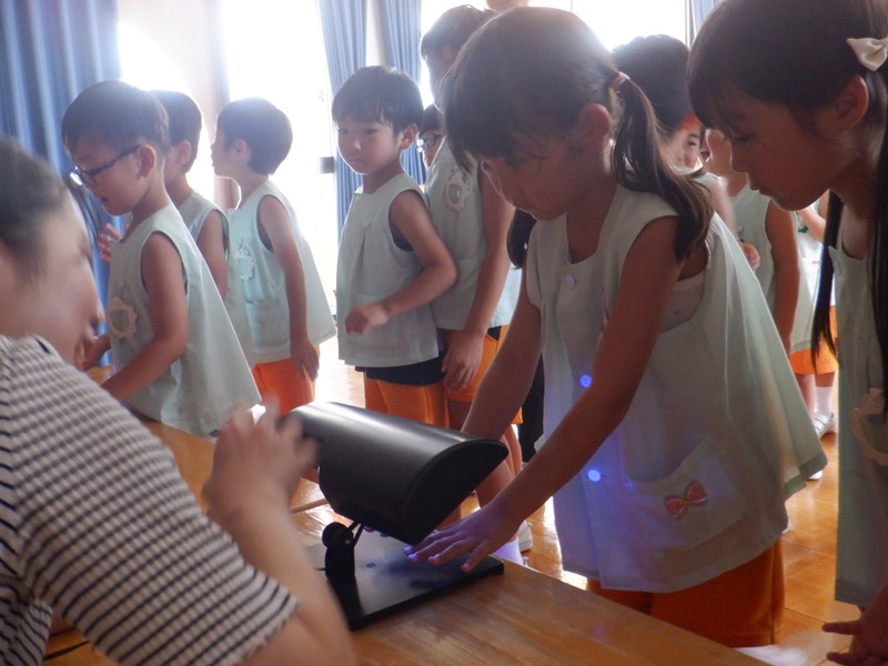 最後に手洗いチェッカーできれいに汚れを落とせているかを確認しました。特殊な光を当てると、クリームを落とし切れていないところは目で見てわかるようになっています。一人ひとり見てもらい、みんなきれいに洗うことができていました。「合格です!」と言ってもらえてみんな嬉しそうでした。