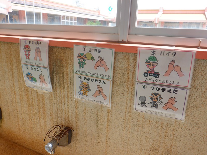 歌に合わせて洗い方を教えてもらいます。手のひらだけではなく、指の間や手の甲、手首なども洗うことが大切です。順番にきれいにしていきます。