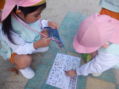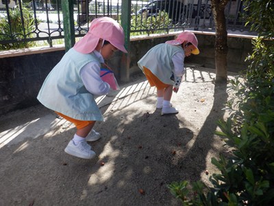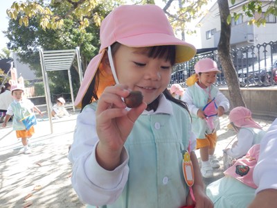 園庭のあちこちに大小さまざまな形をしたどんぐりを見つけると、目をキラキラ輝かせながら「どんぐり!!」と次々に拾う子どもたち。「わあ!みて!」と楽しそうに見せてくれるかわいらしい姿や図鑑と見比べて「どのどんぐりかな?」と探す姿も見られました。