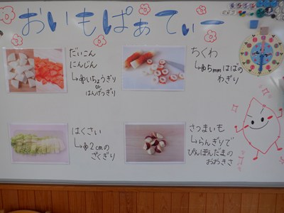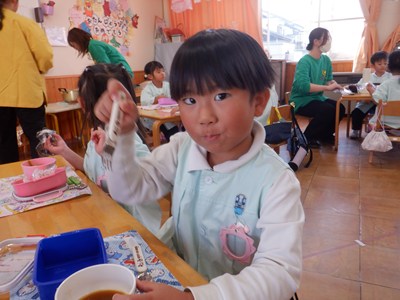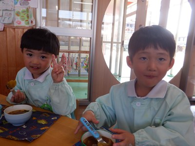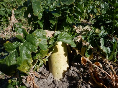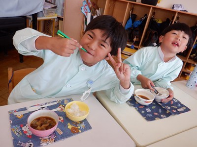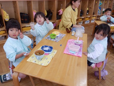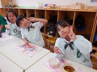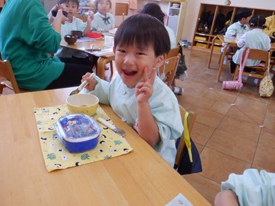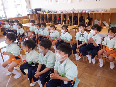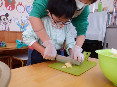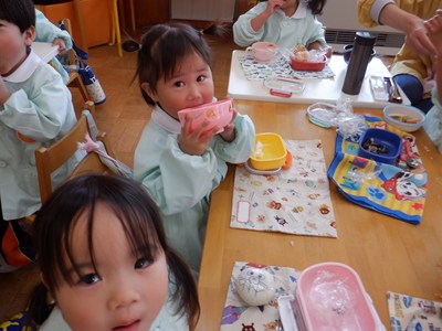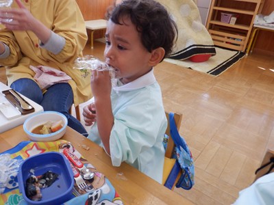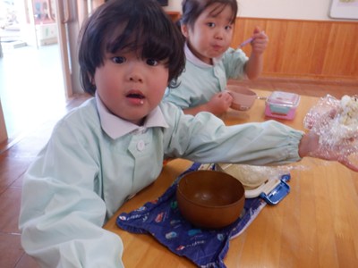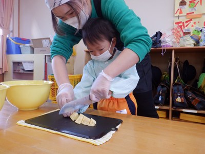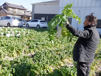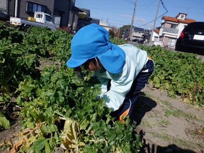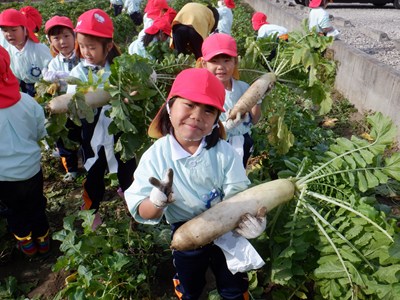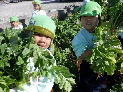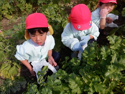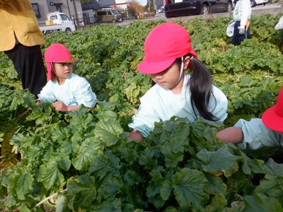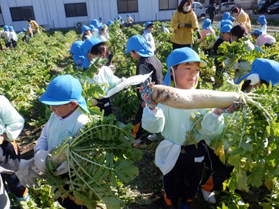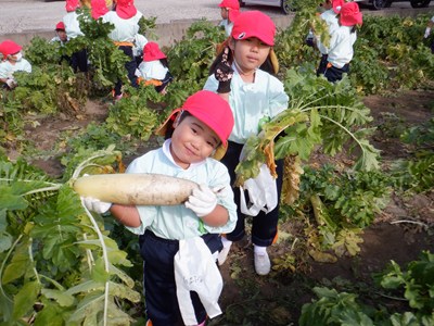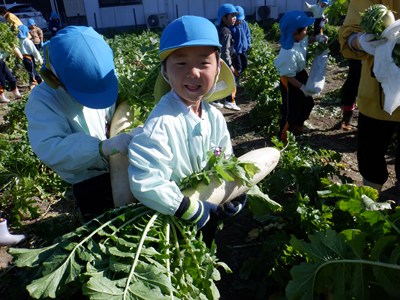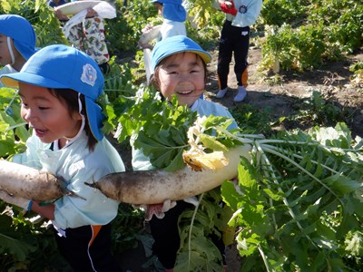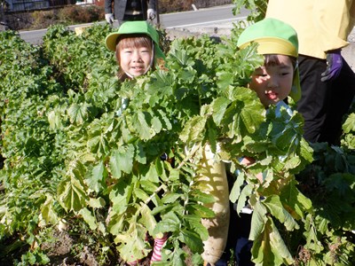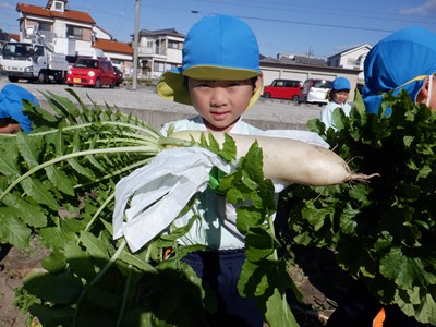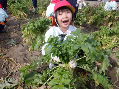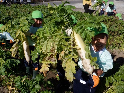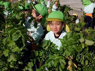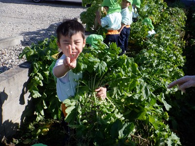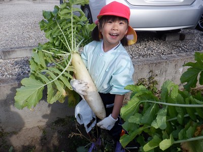 今週は、大根掘りを行いました。自分で自分の持ち帰る大根を収穫します。葉が大きく伸びていて、子どもたちが畑にしゃがむと顔が見えなくなってしまうほどです。年少さんは先生に「これが大きいよ!」と教えてもらって抜いてみますが、なかなか抜けません。下の方を持って、力いっぱい上に引き上げるというポイントを教えてもらったり、先生に助けてもらったりしながら無事に収穫することができました。