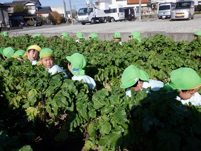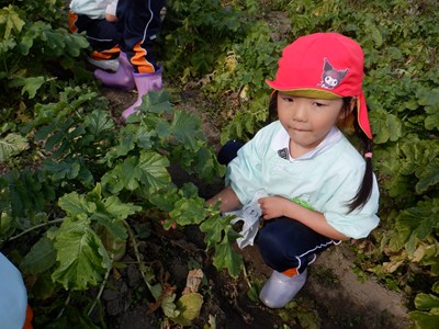 年中や年長さんは、自分で大きそうなものを探して選びます。大きそうなものをちゃんと見つけていました。力が足りなければ友だちと協力したりして、自分たちの力で収穫できました。