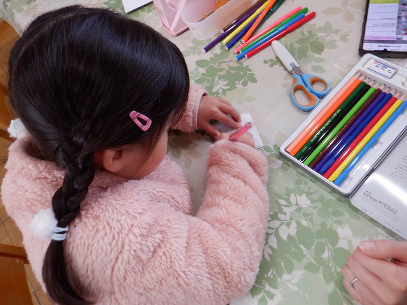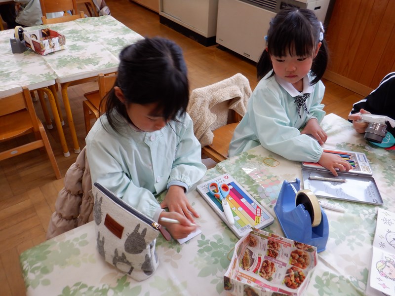 今回は製作活動を行いました。クラスの集合写真を飾るフォトフレームにカレンダーもつけました。製作の中で文字や数字を書いたり、はさみも上手に使い、途中おとうさんおかあさんに手伝ってもらう部分もあり、思い出になるような作品が出来上がりました。