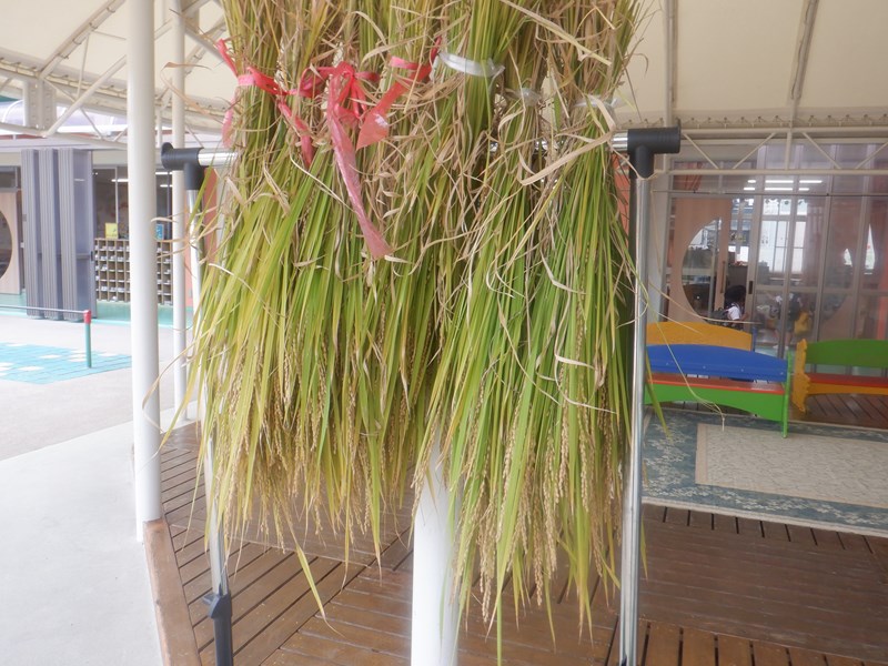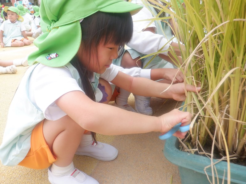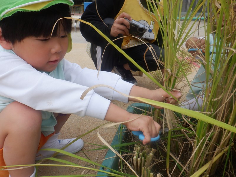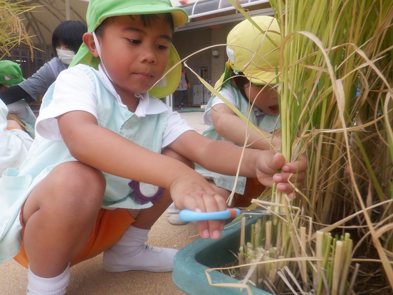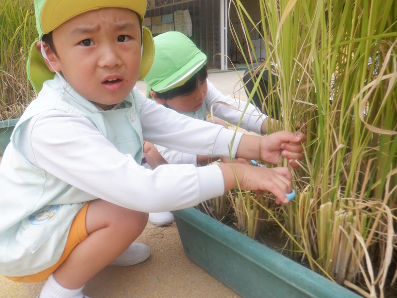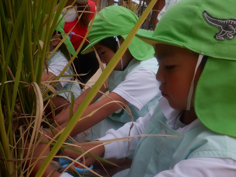 今日収穫したお米は、年長さんが干して籾摺りをし、おいもパーティーの日に釜で炊いていただきます。田植えから消費まで関わることで、食べ物のありがたみを感じることができるのではないでしょうか。大切に育てたお米を残さず食べようと思えるようになると良いですね。