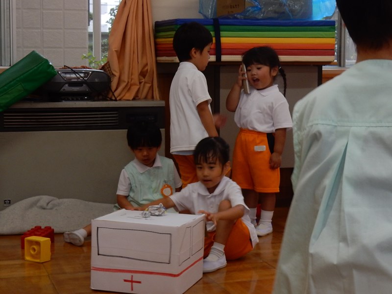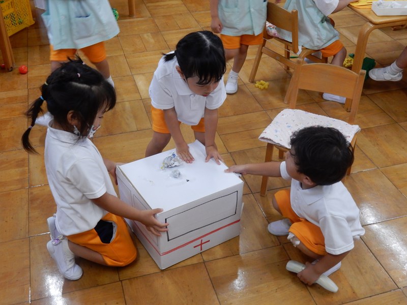 病院ごっこでは、救急車を作ると電話を使って病気やけがの人のために救急車を呼んだり、病院に着くとバンドエイドや薬を処方したり熱を計ったり。また「息をしてない」との声があれば心臓マッサージをするような姿も!