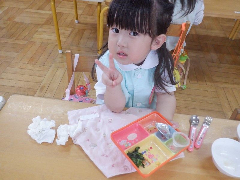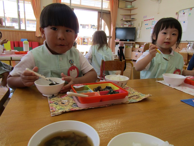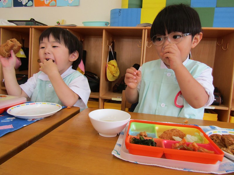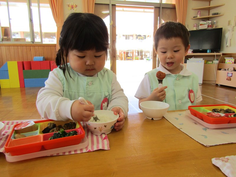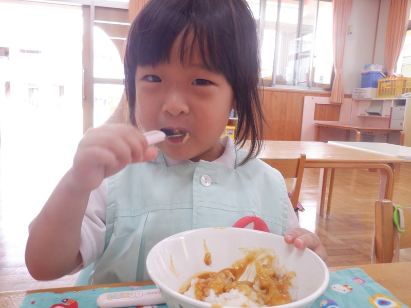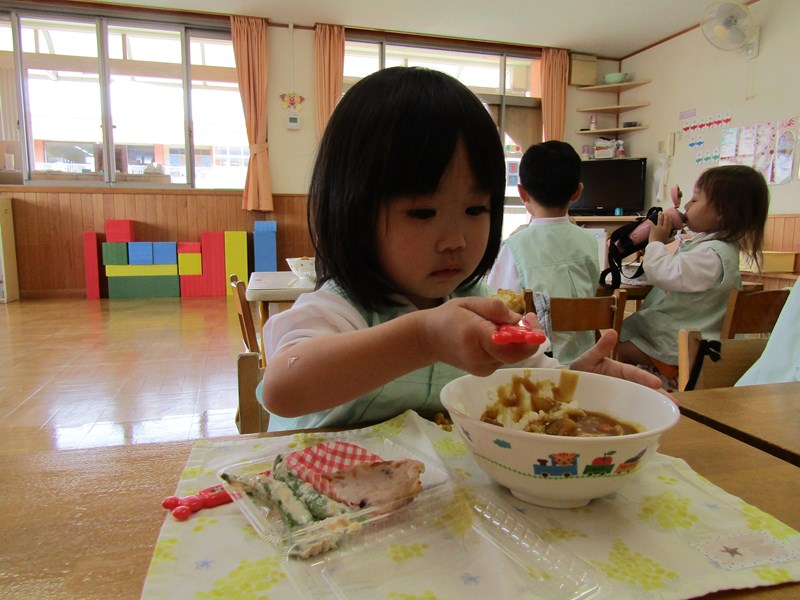 【満3】食欲の秋 食欲の秋ということで、子どもたちが給食を食べている様子をお伝えします。 ひよこぐみさんは、隣や前に座っているともだちと「おいしいね」などと会話を楽しみながら食事をしています。またスプーンやフォークを正しく持って食べられるように練習中です。 おにいさんおねえさんたちに負けないくらいもりもり食べています。これからもたくさん食べて、大きくなろうね!