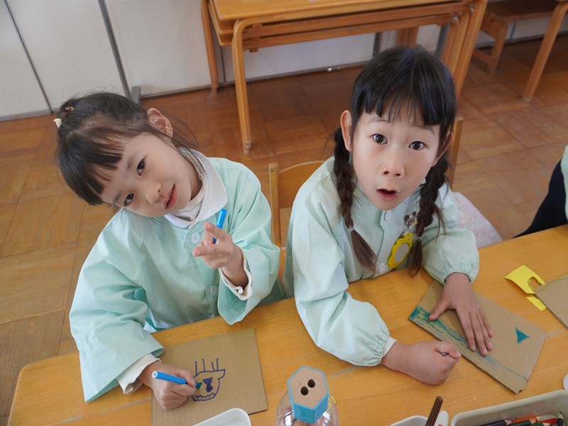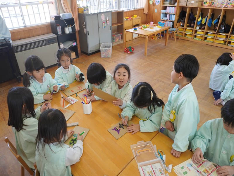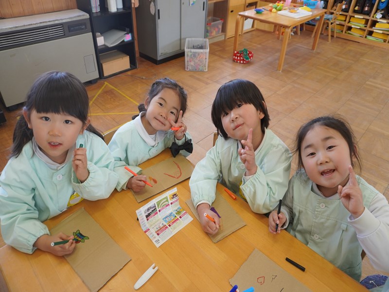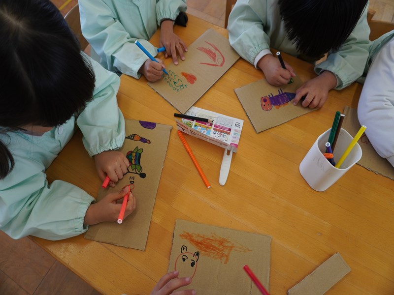 「パズルを作ってみたい!」という子の声を聞き、みんなで挑戦することにしました。好きなキャラクターや虹の絵を描いています。まだ途中ですが完成してみんなで遊ぶのが楽しみです。
