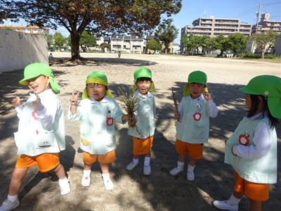広い畑一面にさつまいもが植えられ、みんなやる気満々です。園長先生に採り方を教えてもらっていも掘りスタートです。はじめは土で手が汚れるのが気になったり、虫に驚いたりする子もいましたが、自分の手で採れたことがうれしくてだんだん夢中になっていき、汚れも虫も気にせずたくさん収穫をしてくれました。土のにおいやさつまいもの大きさ、形、重さ。いろんなことに目を向け、興味関心が深まります。自分で採った愛着も出てきますよね。みんな頑張ってたくさん収穫することができました。