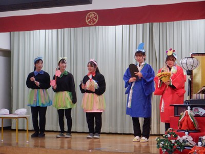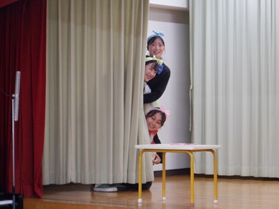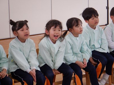 ひなまつり会では、ひなまつりやひな人形にまつわるクイズに答える中で、いろいろなことを教えてもらいました。五人囃子や三人官女の役割を知っている子もいましたね。遊戯室の立派な7段飾りは舞台前に飾られ、じっくり見ることができましたね。