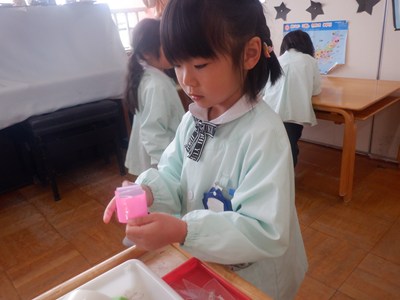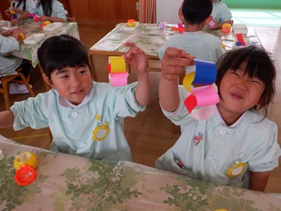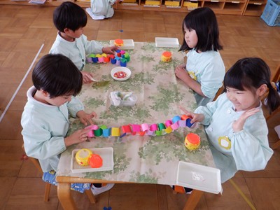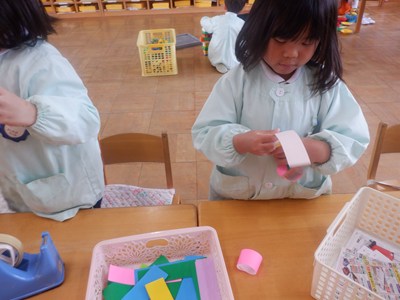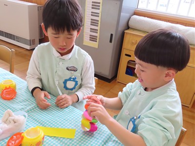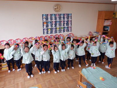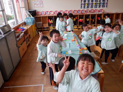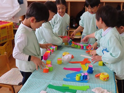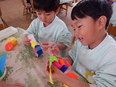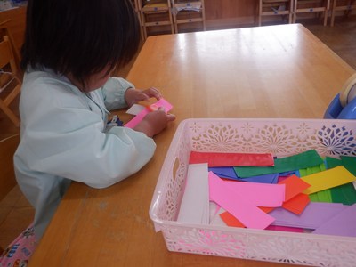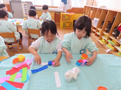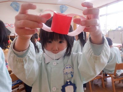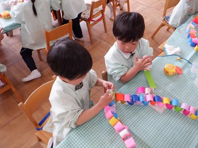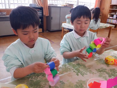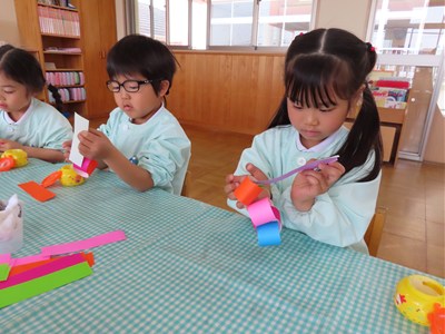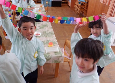 3月4日、5日のお別れ会の準備をみんなで行いました。「年長さん喜んでくれるかな」「びっくりするぐらい飾り作ろう!」とはりきって準備をする姿がありました。友だちと協力をして、長い輪飾りが出来上がると、年長さんを招待できることを心待ちにしていました。
