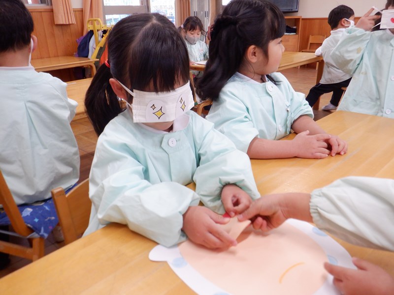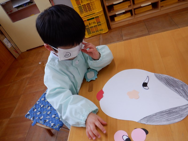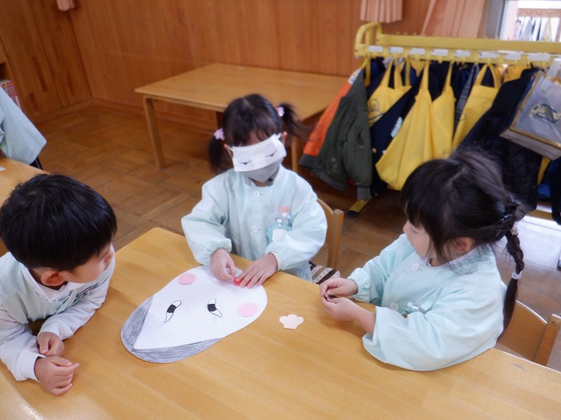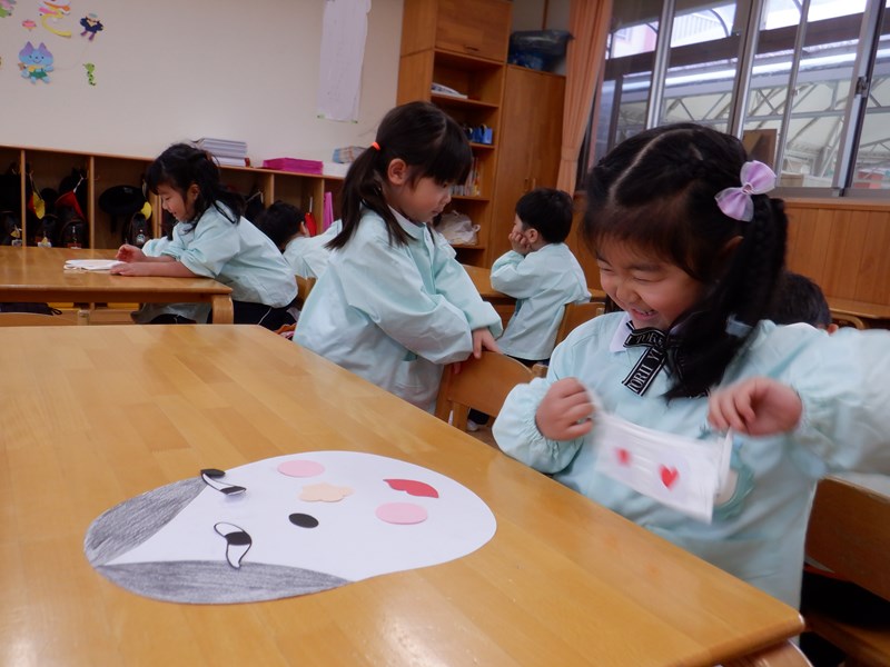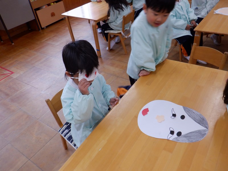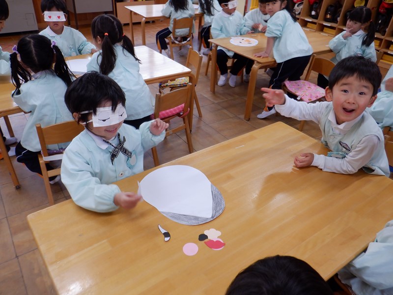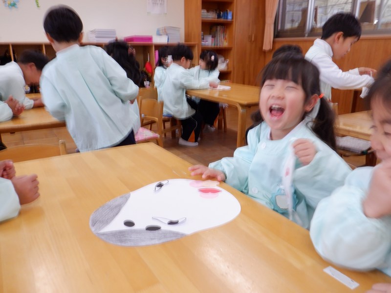 【年少】あやめぐみ 3学期が始まり、あやめぐみでは正月遊びの福笑いをして遊びました。 おたふくとひょっとこの顔をみんなで完成させました。手でしっかり形を確認しながら慎重に置いたり、「もっとこっちだよ!」「どっちなの~?」とともだちと楽しそうに行っていました。目隠しをしているともだちの顔や出来上がった顔を見て「へんな顔ー!!」とたくさん笑って盛り上がりました。 今年も1年にこにこ笑顔で過ごせそうです。 Twitter Facebook Del.icio.us Reddit